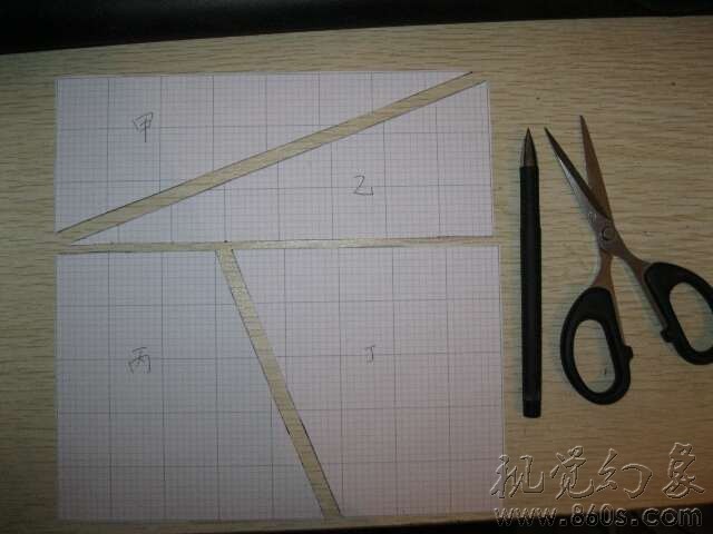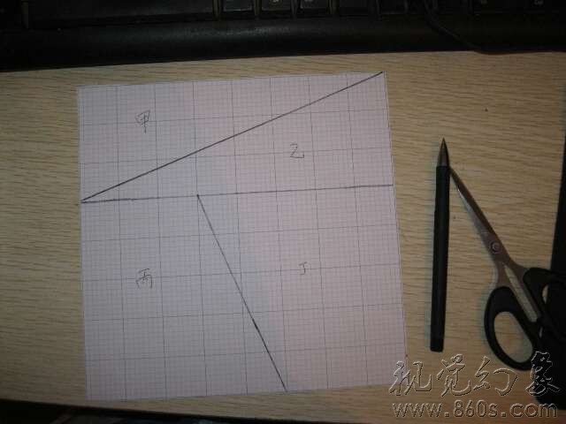 关于这个,昨晚我和朋友进行了深入研究,终于被我们发现了破绽!!! 首先,我们按照图中要求,打印了一份8*8的格子,并且对其剪裁,使之与图相符。并且按图画好线,见下图。