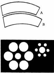 1.引言 视错觉现象随处可见,但对其产生的原因较难完整统一地加以解释这是人类视觉系统和它时外界信息提取及处理过程的复杂性所决定的。当人或动物观察物体时,基于经验主义或不当的参照形成的错误的判断和感知,这就是所谓的视错觉现象。视错觉可分为背景错觉、侧抑制、缪勒莱耶错觉、深度错觉、视觉后像等多种类型,它能从独特的角度显示出视觉系统的认知功能和机理,因此研究错觉原理,建立合适的数学模型和计算机模拟模型,对心理学、生理学和计算机视觉等领域的发展有着重要的意义和应用前景。 2.正文 视错觉就是当人或动物观察物体时,基于经验主义或不当的参照形成的错误的判断和感知。我们日常生活中,所遇到的视错觉的例子有很多。如图1中的A和B是同样大小的,下图中间的圆圈也是同样大的,但在我们看到的却是一大一小。 当把两个有盖的桶装上沙子,一个小桶装满了沙,另一个大桶装的沙和小桶的一样多。当人们不知道里面的沙子有多少时,大多数人拎起两个桶时都会说小桶重得多。他们之所以判断错误,是看见小桶较小,想来该轻一些,谁知一拎起来竟那么重,于是过高估计了它的重量。这就是人类的视错觉现象。 人类研究视错觉的历史可以追溯到公元前4世纪亚里士多德(Aristotle)观察瀑布时记录的运动后效(after-effect),柏拉图(Plato)也曾指明人类永远不可能完全避开错觉去认识一切真相。后来几千年里,视错觉一直处于曲解的位置上,直至19世纪末德国E.Mach发现侧抑制现象时还未获得足够重视【1】。 图1 随着20世纪初德国格式塔(其核心思想是整体大于局部之和)理论逐渐传播,相关研究才逐渐发展。该领域初期多采用行为实验等传统心理学方法获得推论,随着生物实验技术水平的提高和20世纪60年代,S.Coren和JS.Girgus在几何错觉研究中引入系统论方法,其重心逐渐转向神经生物学和计算机领域,设计实验发现相关神经基础来提出和论证心理学说,模拟符合人类视觉机制的数理算法,以促进认知心理学、神经生理学和计算机视觉领域的发展.。 2.1视觉的形成 人眼呈球形,由巩膜所包围,巩膜在前方与透明的角膜相接。角膜之后为晶体,相当于照相机的镜头,是眼睛的主要屈光系统。在晶体和角膜间的前房和后房包含房水,在晶体后的整个眼球充满胶状的玻璃体,可向眼的各种组织提供营养,也有助于保持眼球的形状。在眼球的内面紧贴着一层厚度仅0.3毫米的视网膜,这是视觉神经系统的周边部分。在视网膜与巩膜之间是布满血管的脉络膜,对视网膜起营养作用。 角膜和晶体组成眼的屈光系统,使外界物体在视网膜上形成倒像。角膜的曲率是固定的,但晶体的曲率可经悬韧带由睫状肌加以调节。当观察距离变化时,通过晶体曲率的变化,使整个屈光系统的焦距改变,从而保证外界物体在视网膜上成象清晰。在角膜与晶体之间,有虹膜形成的瞳孔起着光阑的作用。瞳孔在光照时缩小,在暗处扩大来调节着进入眼的光量,也有助于提高屈光系统的成象质量,瞳孔及视觉调节均受自主神经系统控制。眼球的运动由六块眼外肌来实现,这些肌肉的协调动作,保证了眼球在各个方向上随意运动,使视线按需要改变。视网膜是一层包含上亿个神经细胞的神经组织,按这些细胞的形态、位置的特征可分成六类,即光感受器、水平细胞、双极细胞、无长突细胞、神经节细胞,以及近年新发现的网间细胞。其中只有光感受器才是对光敏感的,光所触发的初始生物物理化学过程即发生在光感受器中。 光感受器按其形状可分为两大类,即视杆细胞和视锥细胞。视杆细胞的视色素叫做视紫红质,它具有一定的光谱吸收特性,它是一种色蛋白,由两部分组成,其一是视蛋白;另一部分为生色基团--视黄醛,是维生素A的醛类。在强光照射后,视紫红质大部分被漂白。随着视紫红质的复生,视网膜的对光敏感度逐渐恢复,这是暗适应的光化学基础。当动物缺乏维生素A时,视觉循环受阻,会导致夜盲。视锥细胞的视色素的结构与视紫红质相似,所不同者为视蛋白的类型;其分解和复生过程也相似。 图2是人的视觉成像经过。当外界物体反射来的光线带着物体表面的信息经过角膜、房水,由瞳孔进入眼球内部,经聚焦在视网膜上形成物象(如一)。物象刺激了视网膜上的感光细胞,这些感光细胞产生的神经冲动,沿着视神经传入到大脑皮层的视觉中枢,即大脑皮层的枕叶部位,在这里把神经冲动转换成大脑中认识的景象(如二)。这些景象的生成已经经过了加工,是"角度感"、"形象感"、"立体感"等协同工作,并把图像根据摄入的信息在大脑虚拟空间中还原,还原等于把图像往外又投了出去(如三)。虚拟位置能大致与原实物位置对准,这才是我们所见到的景物(如四)。 2.2视错觉的形成原理 2.2.1马赫带效应 马赫带效应(Machbandeffect)是物理学家兼哲学家马赫(E.Mach)于1865年首先说明的。它为主观的明度感觉视亮度与被视物体表面光亮度之间并不成简单的比例关系提供了一个基本的证明。它是指视觉的主观感受在亮度有变化的地方出现虚幻的明亮或黑暗的条纹,马赫带效应的出现是人类的视觉系统造成的。 图3马赫带效应示意图 如图4所示,图中虚线表示刺激图像的实际光亮度分布,实线表示观察者所感觉到的图形中的亮度分布客观的图形中,左侧高亮度区(α-β区)内刺激强度是相同的,右侧低亮度区(