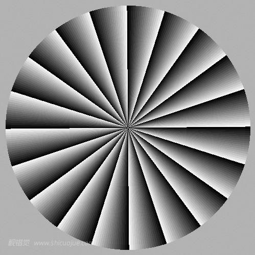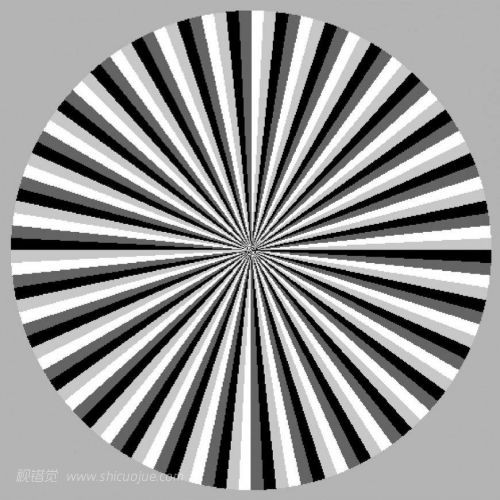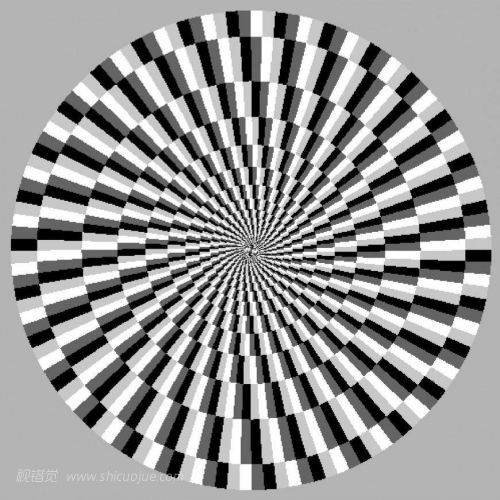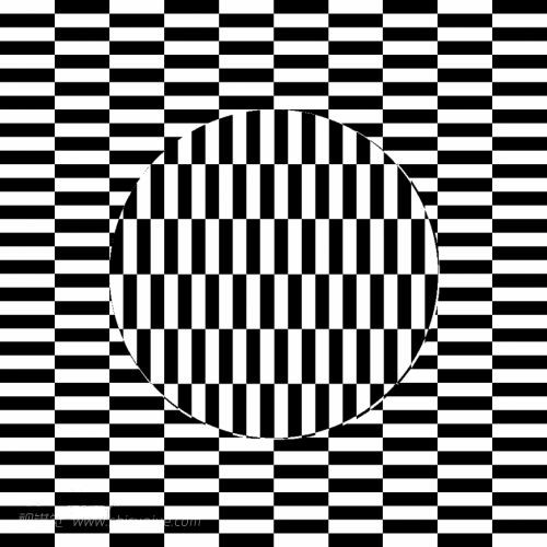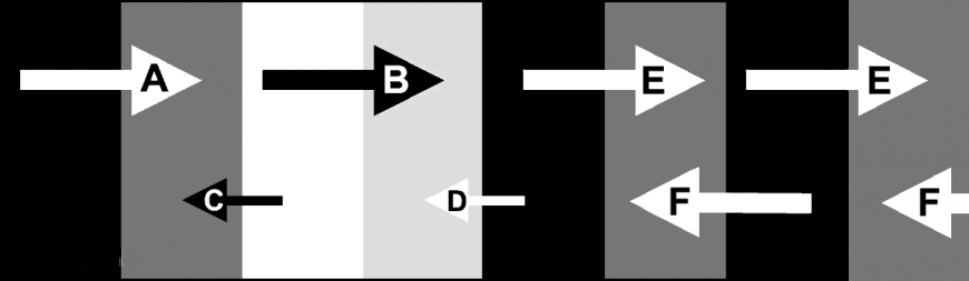 Gregory和Heard于1983在论文《Visual dissociations of movement, position, and stereo depth: Some phenomenal phenomena》 中首次描述了这种非对称亮度变换(asymmetric luminance steps)导致旋转视错觉的现象。 Akiyoshi Kitaoka于2003年创作 北冈明佳(Akiyoshi Kitaoka)在他2003年的论文《Explanation of the elemental illusion (optimized Fraser-Wilcox illusion)》中指出,这种视错觉现象可以称之为余光游移视错觉(peripheral drift illusion),只有用余光观察才能看到视错觉发生。并且四种不同亮度的颜色是产生这种错觉的必须条件,据估计这种非对称的亮度变换会触发人类的运动探测神经。如:上图中的黑、蓝、白、黄。如果把这四种颜色定义为:极暗色、暗色、极亮色、亮色,那么视错觉旋转的方向倾向于:极暗色->比邻的暗色,或者,极亮色->比邻的亮色。 所谓非对称亮度变换可以这样解释,请首先看上图的左半部分,四种颜色从左至右的亮度值分别是0、120、255、220。而上述论文的理论中指出:极暗色总是倾向于向暗色的方向旋转,也就是图中的A和D都可能发生,但是A从左至右0->120的亮度跨度是120,D从右至左0->220的跨度是220,亮度跨度越小产生的视错觉效果越强烈,所以说A向视错觉的强度是大于D向强度。同时,论文中也指出:极亮色也总是倾向于向亮色的方向旋转,于是图中B和C都会发生,但B的左右跨度是35,C的右左跨度是135,于是B的效果是大于C。所以,尽管图中左半部分这样的颜色布局会产生反向旋转的视错觉效果,但是反向的总效果是小于正向的(C + D < A + B),于是朝一定方向旋转的视错觉效果便产生了。 接下来,我们来看上图的右半部分,两种颜色的亮度分别为0、120,E向的左右跨度和F向的右左跨度同为120,所以两个方向的视错觉强度是对称相等的,然而在整个图像上视错觉的总强度为零,旋转效果无法产生!所以说,Akiyoshi Kitaoka提出“四种不同亮度的颜色是产生旋转视错觉的必须条件”,因为只有像上图左半部分这样安排颜色布局——图中每种颜色过渡到它右边颜色的亮度跨度的总和大于每种颜色过渡到它左边颜色的亮度跨度总和,才能产生出总的朝一个方向旋转的视错觉效果。而同一张图像上,向某个方向亮度变换的总跨度不等于向另外方向亮度变换的总跨度,即为“非对称亮度变换”。当然四种颜色是产生非对称亮度变换所需要的最小颜色数量,两种颜色(上图右半部分)和三种颜色都是不可能实现的。 所以如果按照上图左半部分的规律安排颜色过渡,将会产生余光游移视错觉(图一)。但是Akiyoshi Kitaoka等人还发现,图一中这种渐进式的亮度变换会减弱对运动神经的刺激进而降低错觉的效果,并且长而连续的色块和直线边缘对于错觉效果也有弱化作用(图二),但是具有间断(图三)或者曲线(图四,这是另一个视错觉:大内错觉,放在这里为说明曲线边缘的作用)边缘的清晰色块将会大大强化视错觉效果。 |